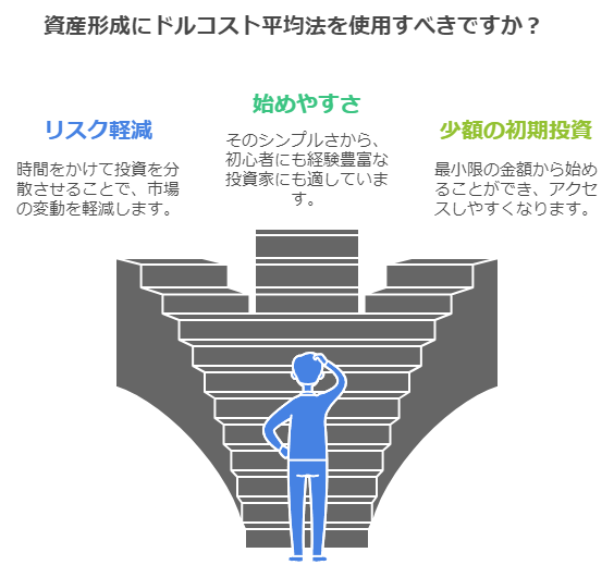ドルコスト平均法は、市場のタイミングを予測する必要がないため、価格変動によるリスクを抑えることができます。特に、初心者が投資を始める際に感じる不安を軽減する手助けとなります。