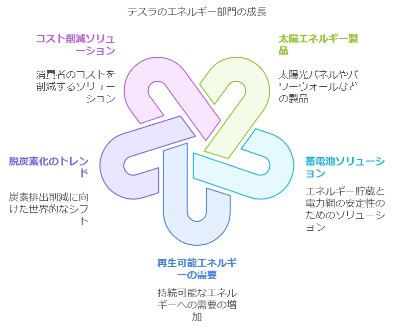 テスラは、自動車販売だけでなく、エネルギー部門でも存在感を強めています。この部門は、太陽光発電システムや家庭用蓄電池「パワーウォール」などの製品を通じて、持続可能なエネルギー社会の実現を目指しています。