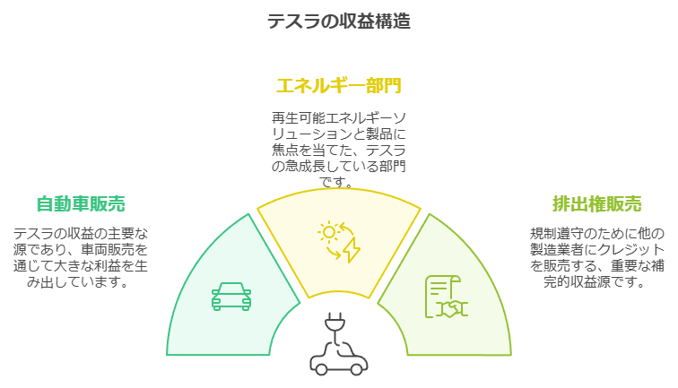 排出権取引は、自動車販売の利益を補完する重要な収益源です。特に、各国が環境規制を強化する中で、この取引の需要はさらに高まると予想されています。この仕組みを活用することで、テスラは環境保護と利益確保を同時に達成しています。