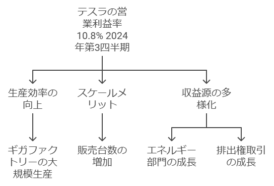 テスラは、自動車販売、エネルギー部門、排出権取引という多角的な収益源を持ち、高い利益率を維持しています。また、広告費を削減しながらも強力なブランドイメージを確立し、持続可能な成長を続けています。